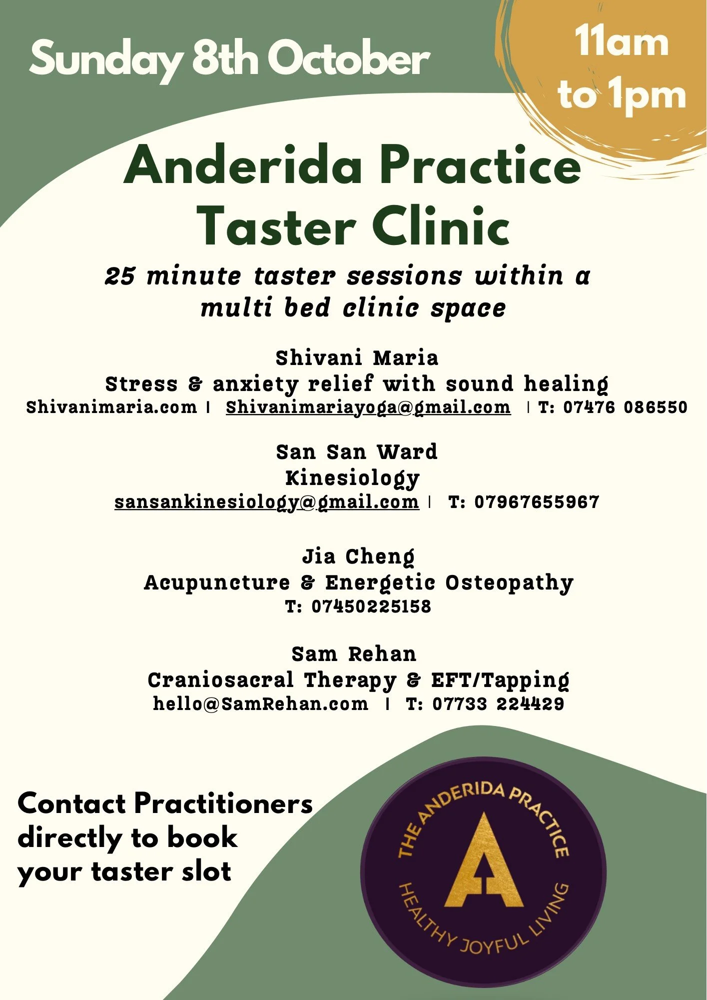Please contact practitioners directly to book, or email me on anderidatasters@gmail.com for more info or details on more upcoming clinics/future practitioners